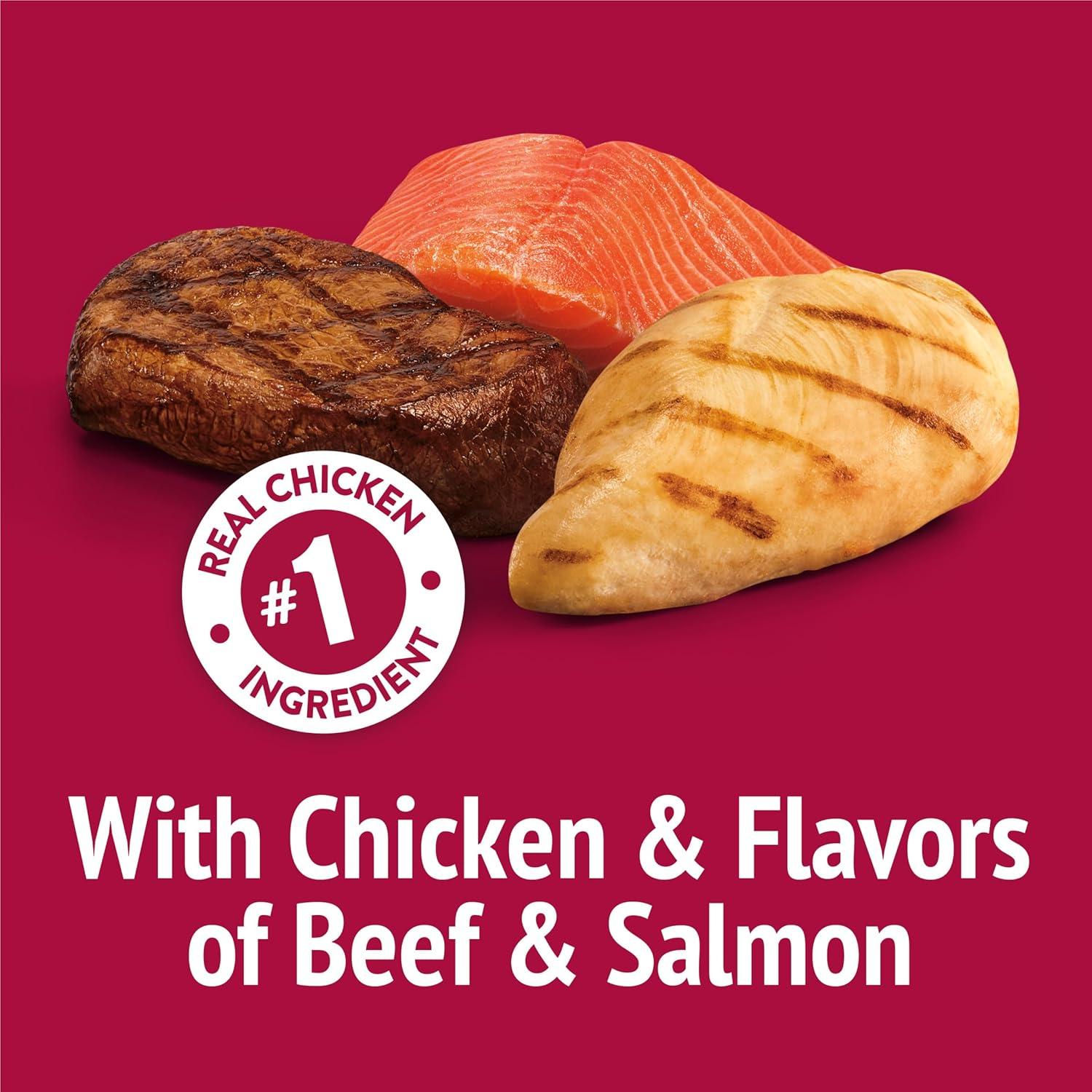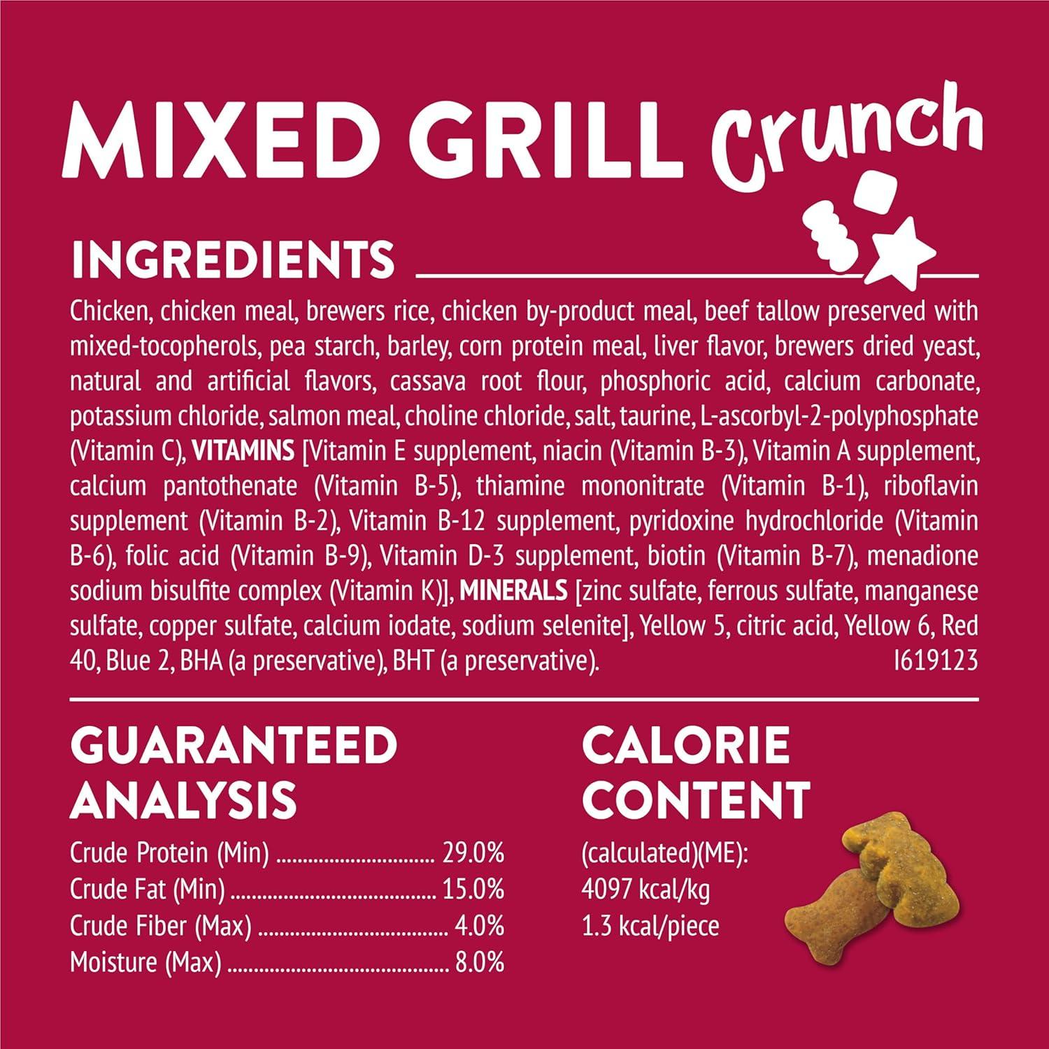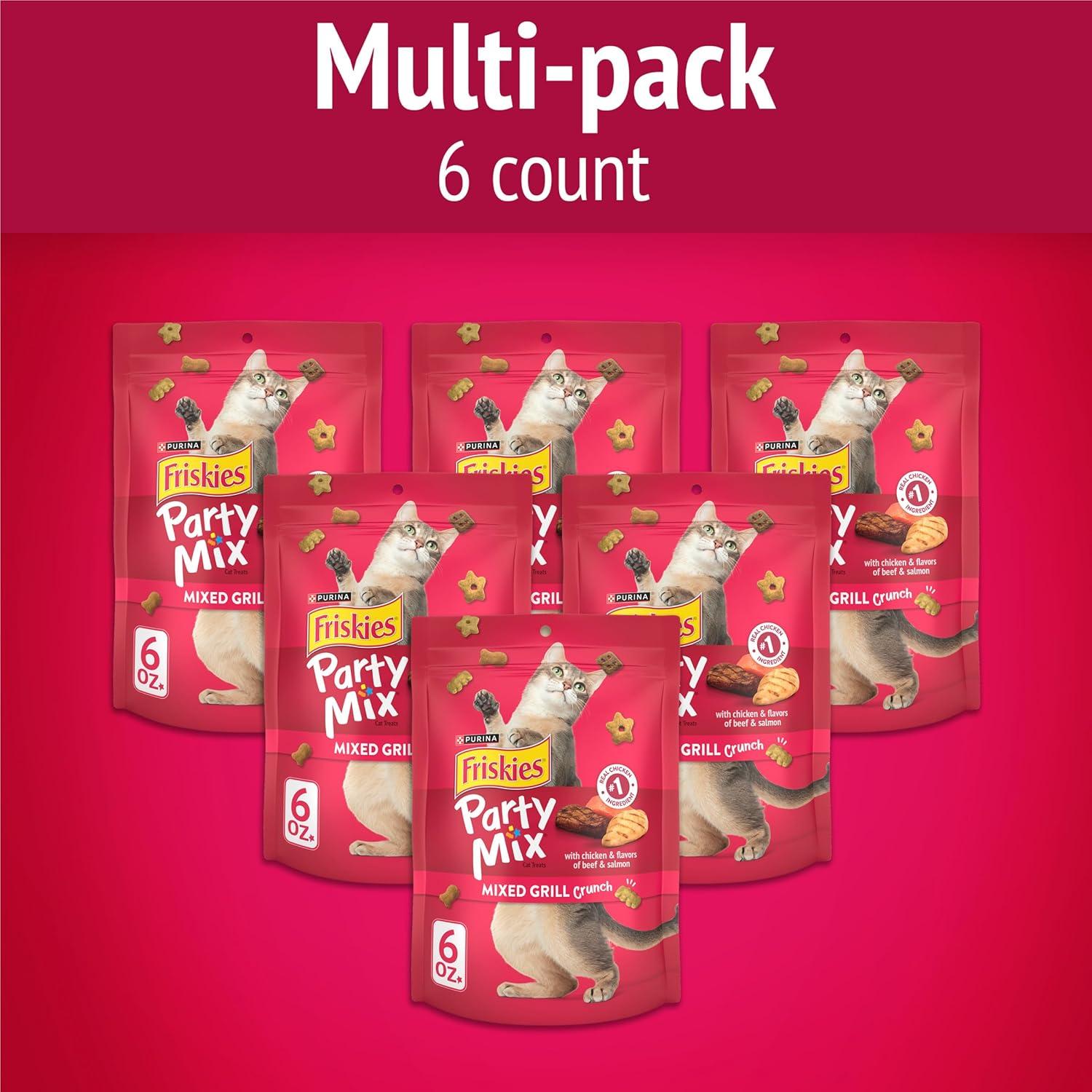 Give your cat a burst of delicious flavor at treat time with Purina Friskies Party Mix Mixed Grill Crunch adult cat treats. Real chicken is the number 1 ingredient, and every bite of these cats treats delivers a tempting combination of chicken, beef and salmon flavors to please your cat's palate. The satisfying crunchy texture is sure to have her licking her lips after every nibble, and the intriguing shapes add extra fun to snack time each day. Toss her a piece between meals as a tasty reward for being your best friend, or offer up a few cat treats whenever you want to spend a few moments cuddling with your cat companion. At less than 2 calories per treat, this Purina Friskies Party Mix cat treats recipe offers a guilt-free way to indulge her cravings for savory, meaty goodness. She gets a mouthwatering snack she can't resist, and you get the satisfaction that comes from putting a smile on her face. Try these Friskies cat treats today to let her know just how much she means to you.
