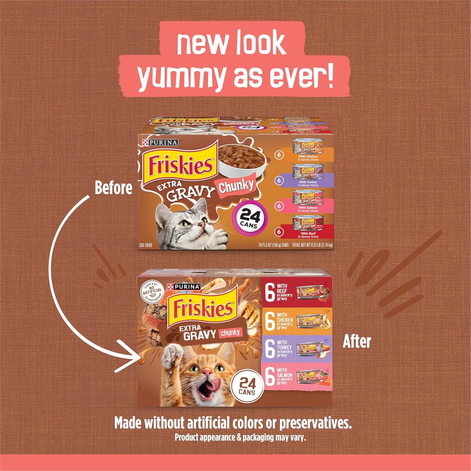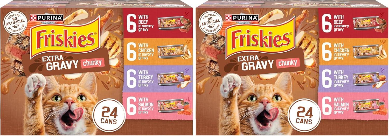 Give your cat one more reason to lick her whiskers at mealtime when she tastes the extra gravy found in each can of this Purina Friskies Extra Gravy Chunky wet cat food variety pack. Four mouthwatering recipes deliver the variety adventure-loving cats crave, and each wet cat food entree is made with real meat, poultry or seafood for the flavors she loves. Extra savory gravy adds flavor, tempting her to lick her dish clean at feeding time. The tender, meaty chunks deliver an enticing texture she's sure to savor, and the tantalizing aroma draws her to her dish and encourages her to lap up every last drop. Choose a different recipe at each feeding to keep her excited about the foods you feed her, and watch your cat companion come running to her bowl in anticipation of a yum-filled dining experience that makes her purr. Every time you fill your Amazon shopping cart with Purina Friskies wet cat food, you're one step closer to giving your cat the scrumptious goodness she deserves.