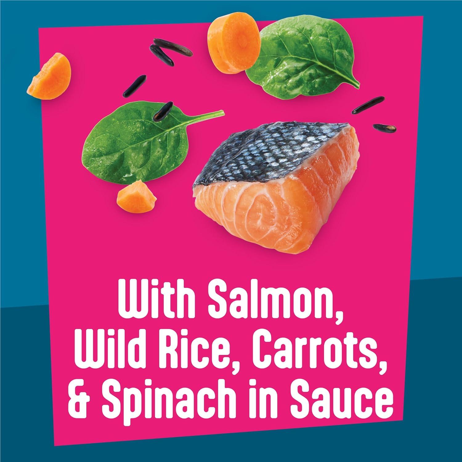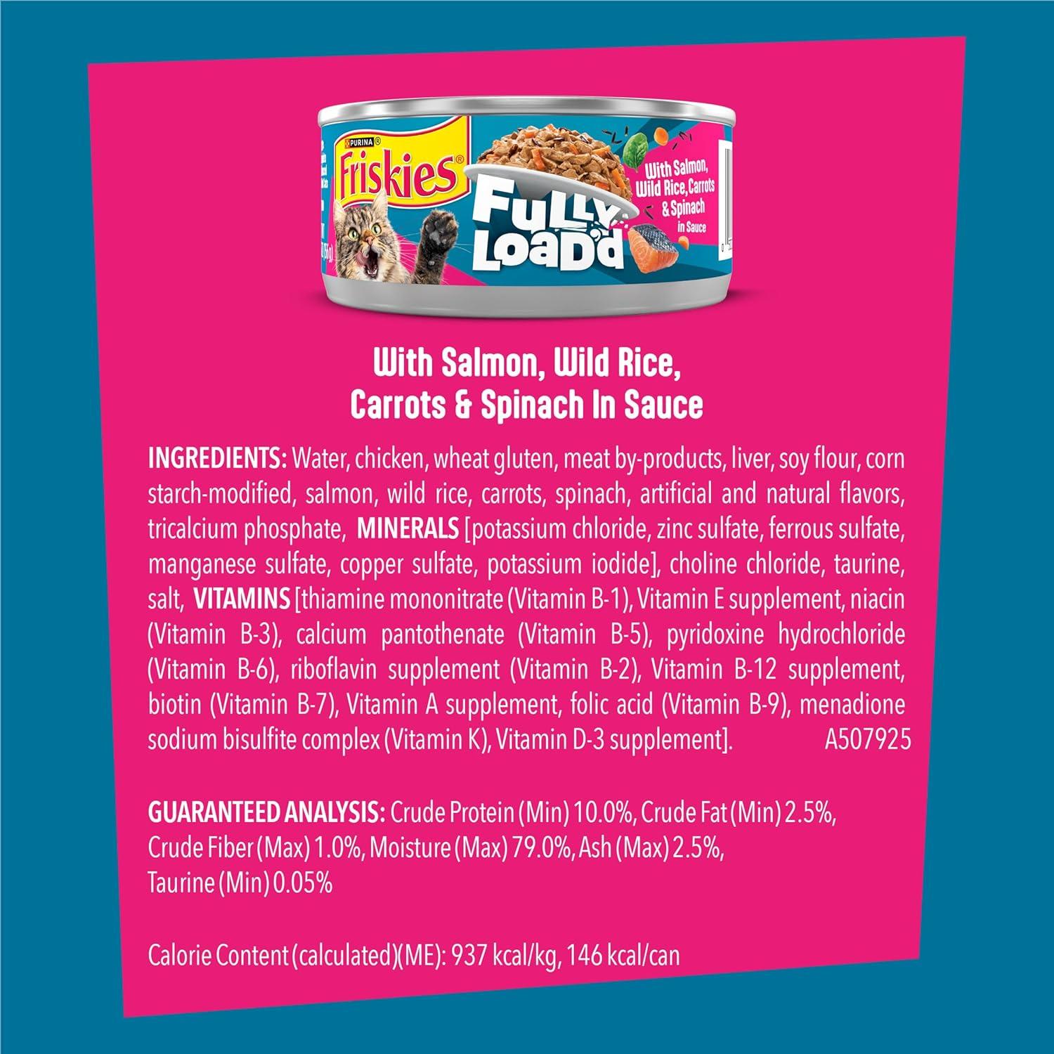 Get your cat amp’d up for mealtime with mouthwatering ingredients in Purina Friskies Fully Load’d With Salmon, Wild Rice, Carrots and Spinach in cat gravy. Made with high-quality protein, this recipe delivers the purrfect flavor combination of seafood, rice, and vegetables for a complete adult cat food. This cat food wet recipe features super chunky, hearty morsels load’d with rice and veggies, all coated in savory gravy for a taste cats can’t resist. Watch as the rich aroma of Friskies wet food for cats piques their curiosity every time you open a can and pour it into their bowl. Let her delight in the savory taste and texture that supports healthy cat hydration in each bite. With 100 percent balanced nutrition for adult cats in every serving, this Purina Friskies Fully Load’d recipe makes it easy to offer her high-quality meals that also meet her nutritional needs. Fill her dish with this next-level adult cat food at mealtime or pair it with their favorite Friskies dry food for a meal combination that will get her excited for every serving.