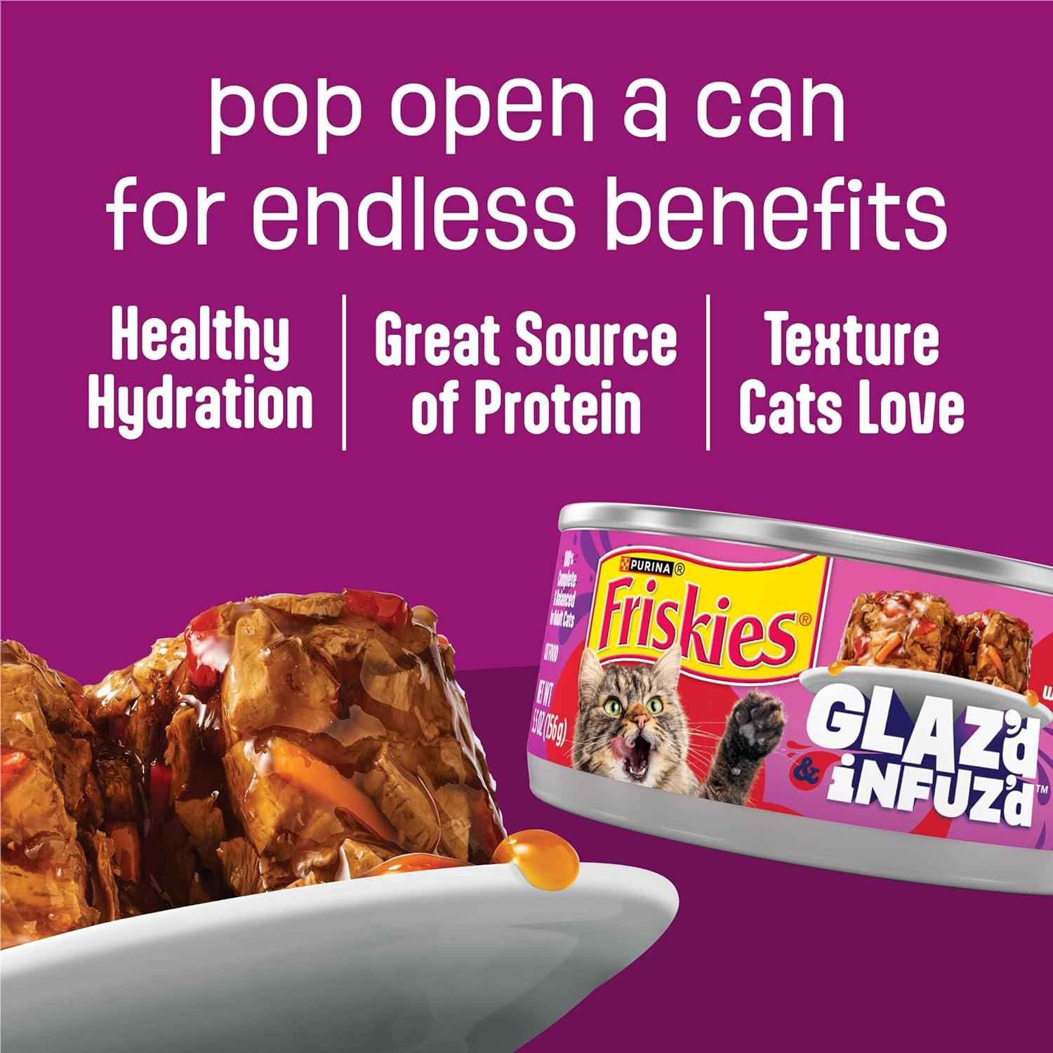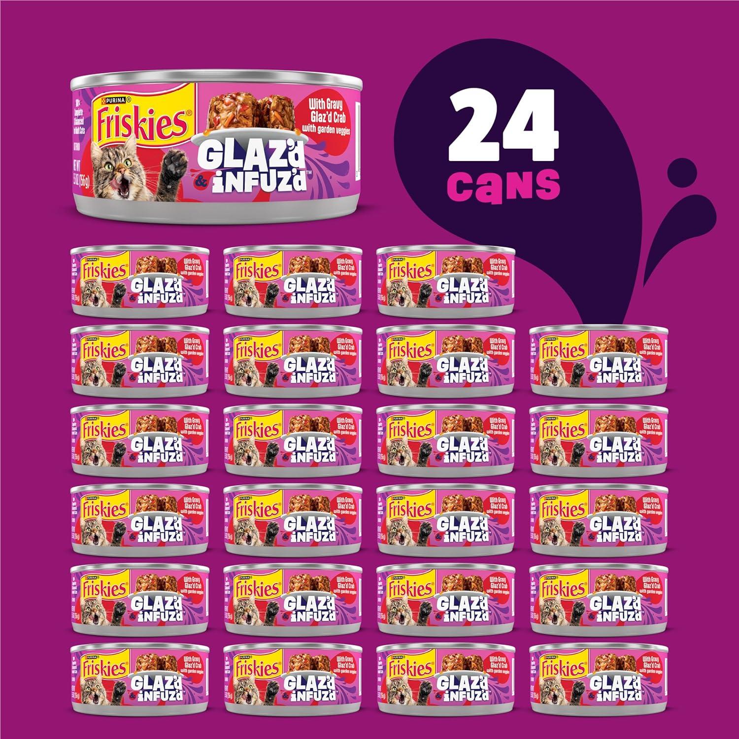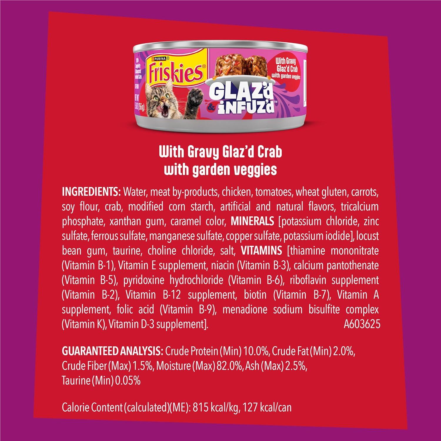 Amp up mealtime with a flavor your cat can’t resist with Purina Friskies Glaz’d and Infuz’d With Crab in cat gravy. Made with high-quality protein, this wet cat food seafood recipe delivers the delicious taste of crab in super chunky, hearty morsels coated in a rich gravy glaze that sticks to every bite for an explosion of flavor and a taste cats love. Watch as the rich aroma of Friskies gravy wet cat food piques their curiosity every time you open a can and pour it into their bowl. Let them delight in the savory tastes and textures that support healthy cat hydration in each bite. With 100 percent balanced nutrition for adult cats in every serving, each Purina Friskies Glaz’d and Infuz’d recipe makes it easy to offer them high-quality meals that also meet their nutritional needs. Fill their dish with this next-level adult cat food at mealtime or pair it with their favorite Friskies dry food for a meal combination that will get them excited for every serving.