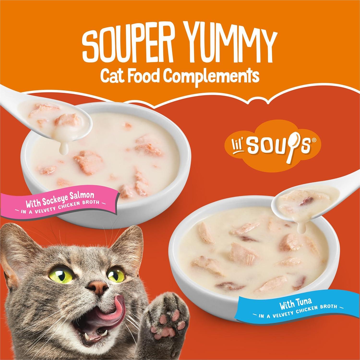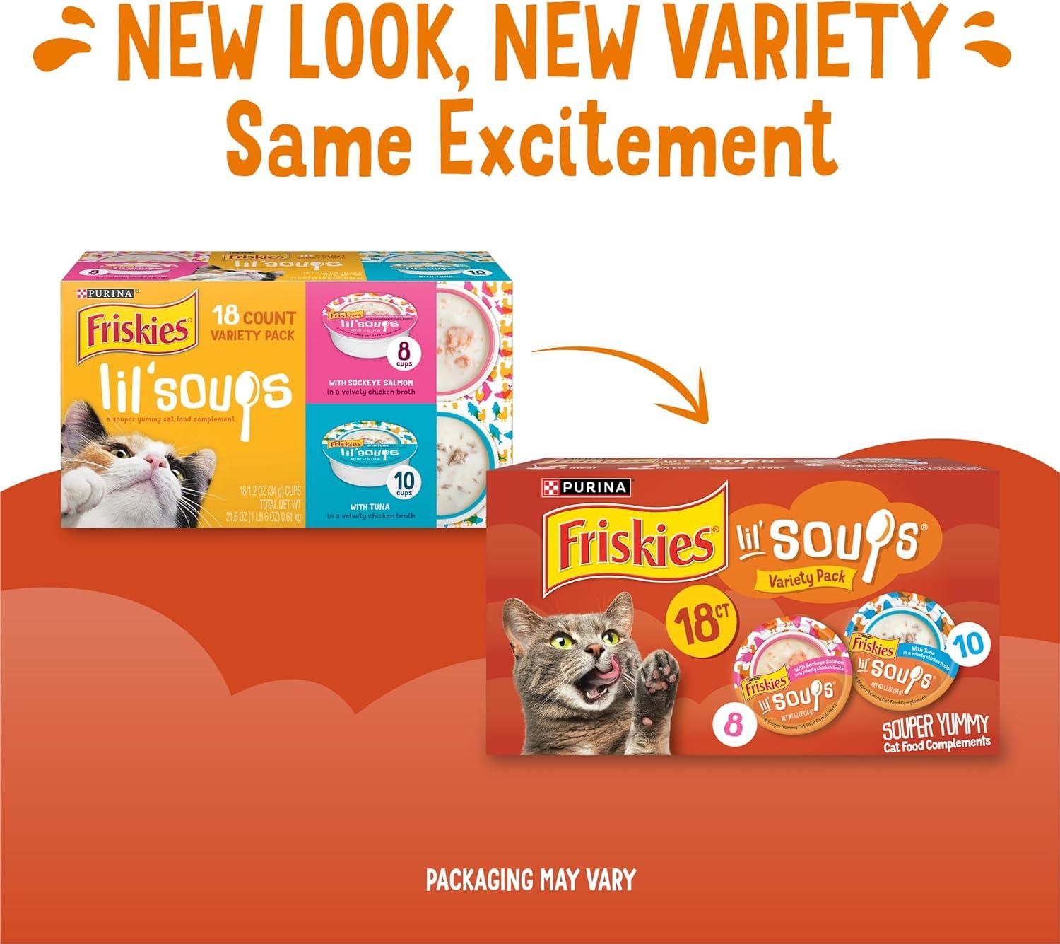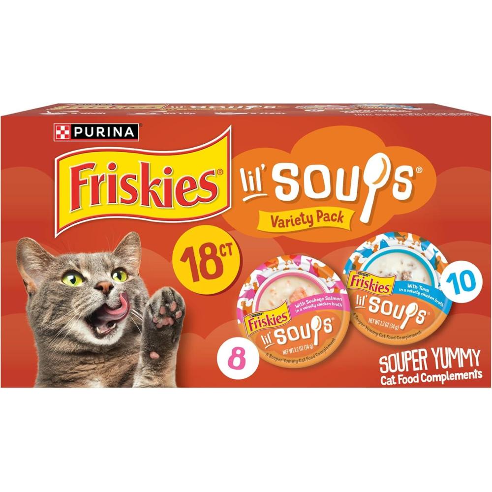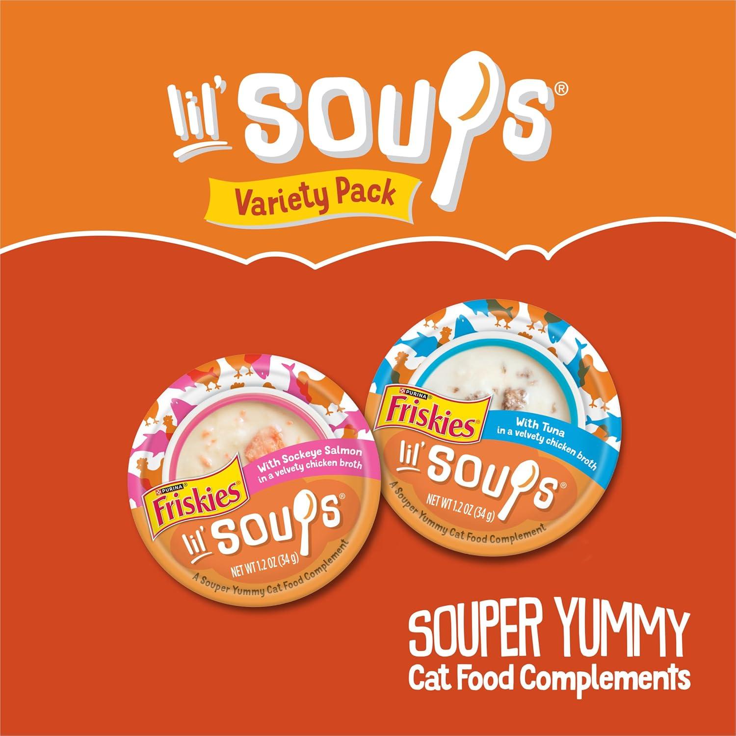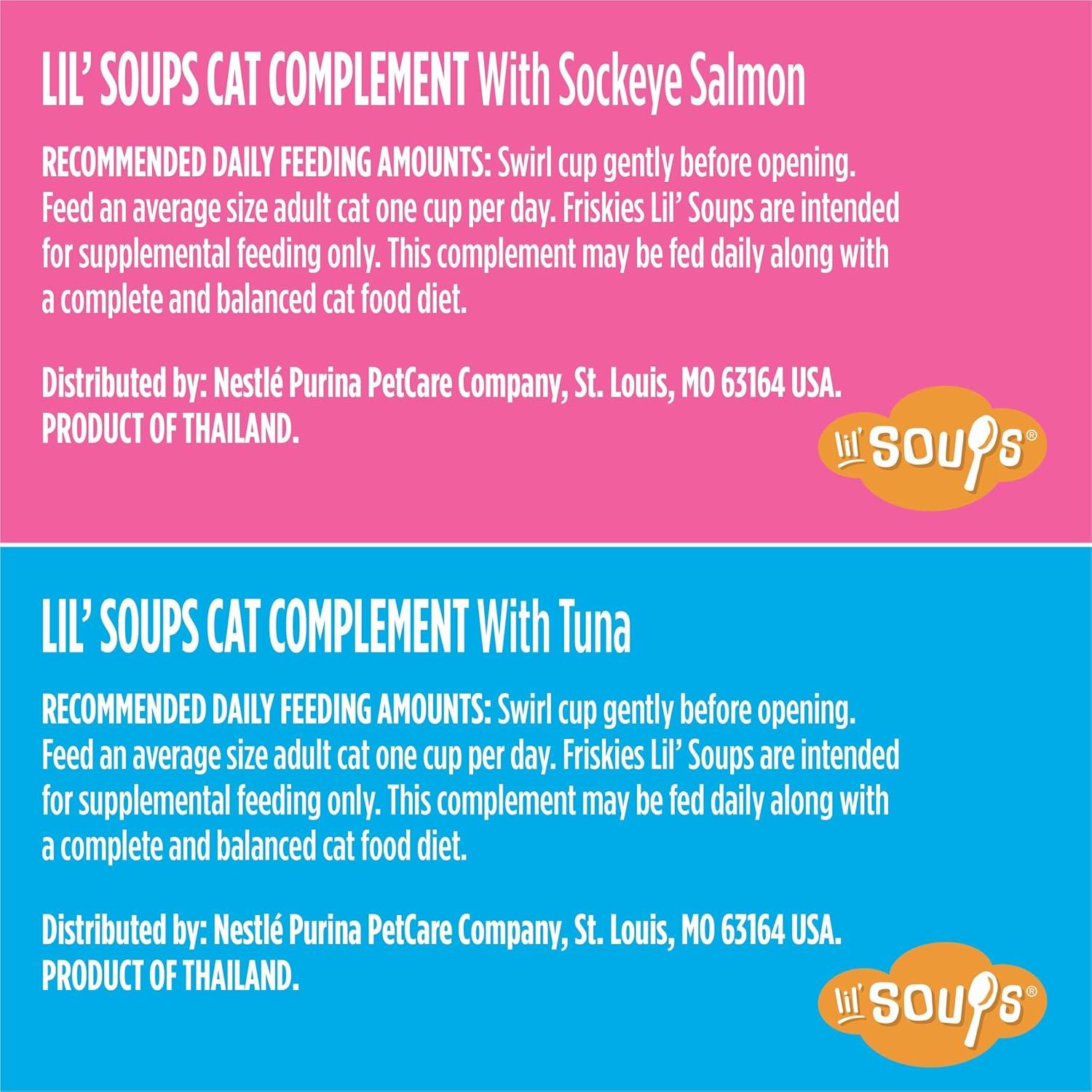 Dote on your darling cat when you offer her recipes from this Purina Friskies Lil' Soups adult wet cat food complement variety pack. Two delectable recipes make it easy to keep her taste buds satisfied. With real seafood in every cup, these adult wet cat food complements bring delicious goodness to her dish. She's sure to love the tender texture and enticing aroma found in every serving, and you can feel good about serving her snacks that are free from fillers and by-products. A velvety broth rounds out each cat complement variety, bringing added flavor and moisture to every whisker-licking bite. These treats for cats feature a rich aroma that calls out to her every time you open a cup, letting her know something amazing is coming her way. Give your cat what she needs when she needs it with an order of Purina Friskies Lil' Soups adult wet cat food complement variety pack from Amazon.com.