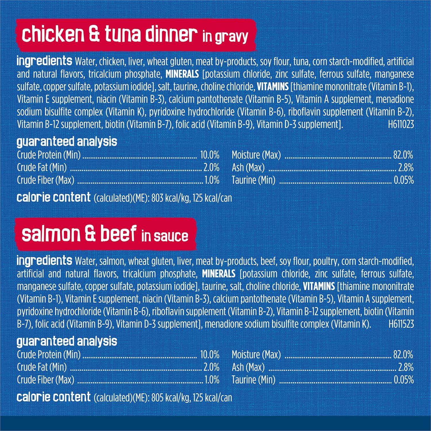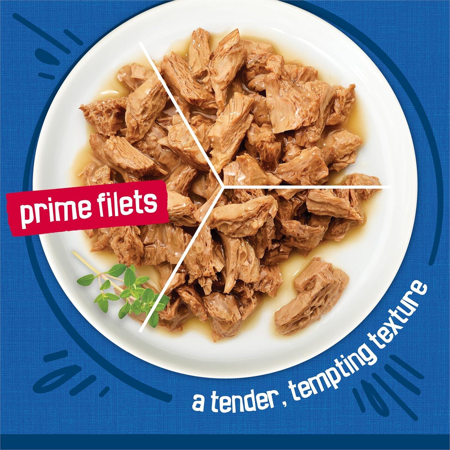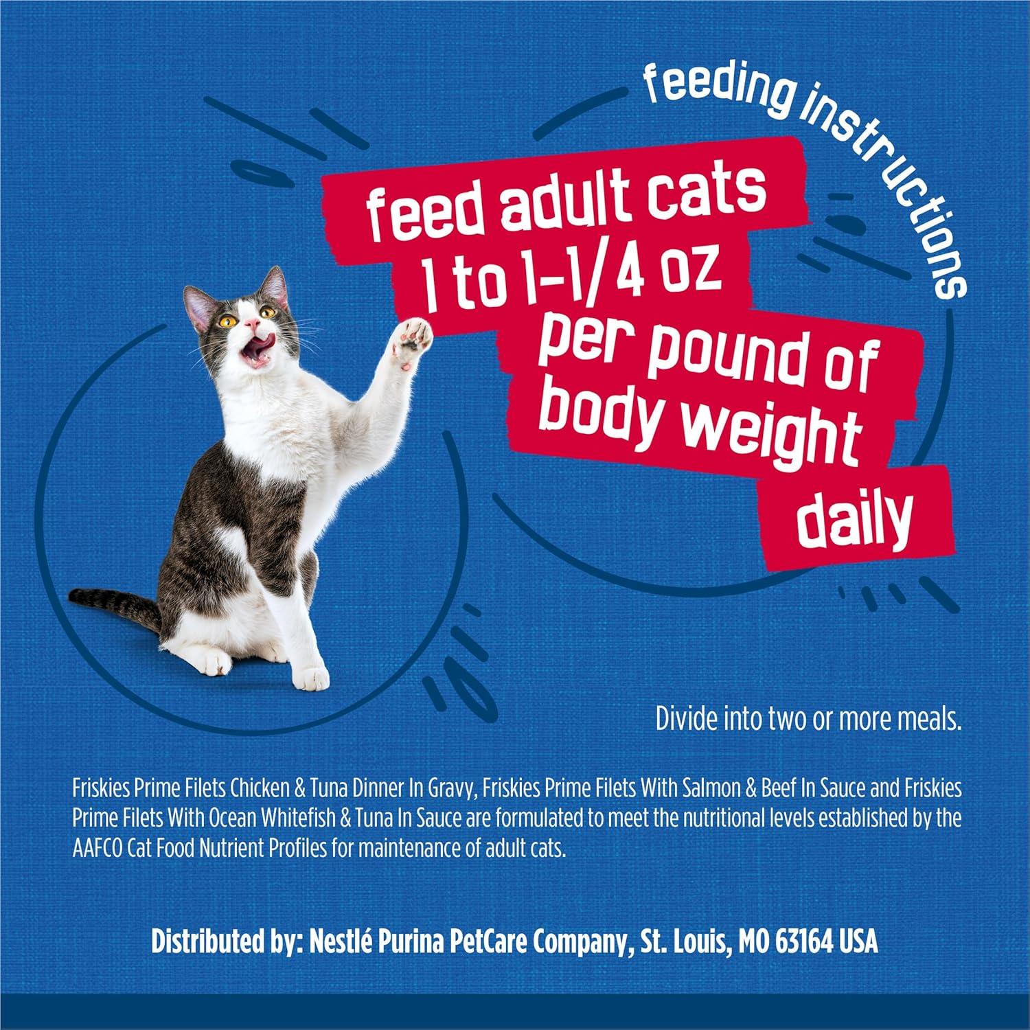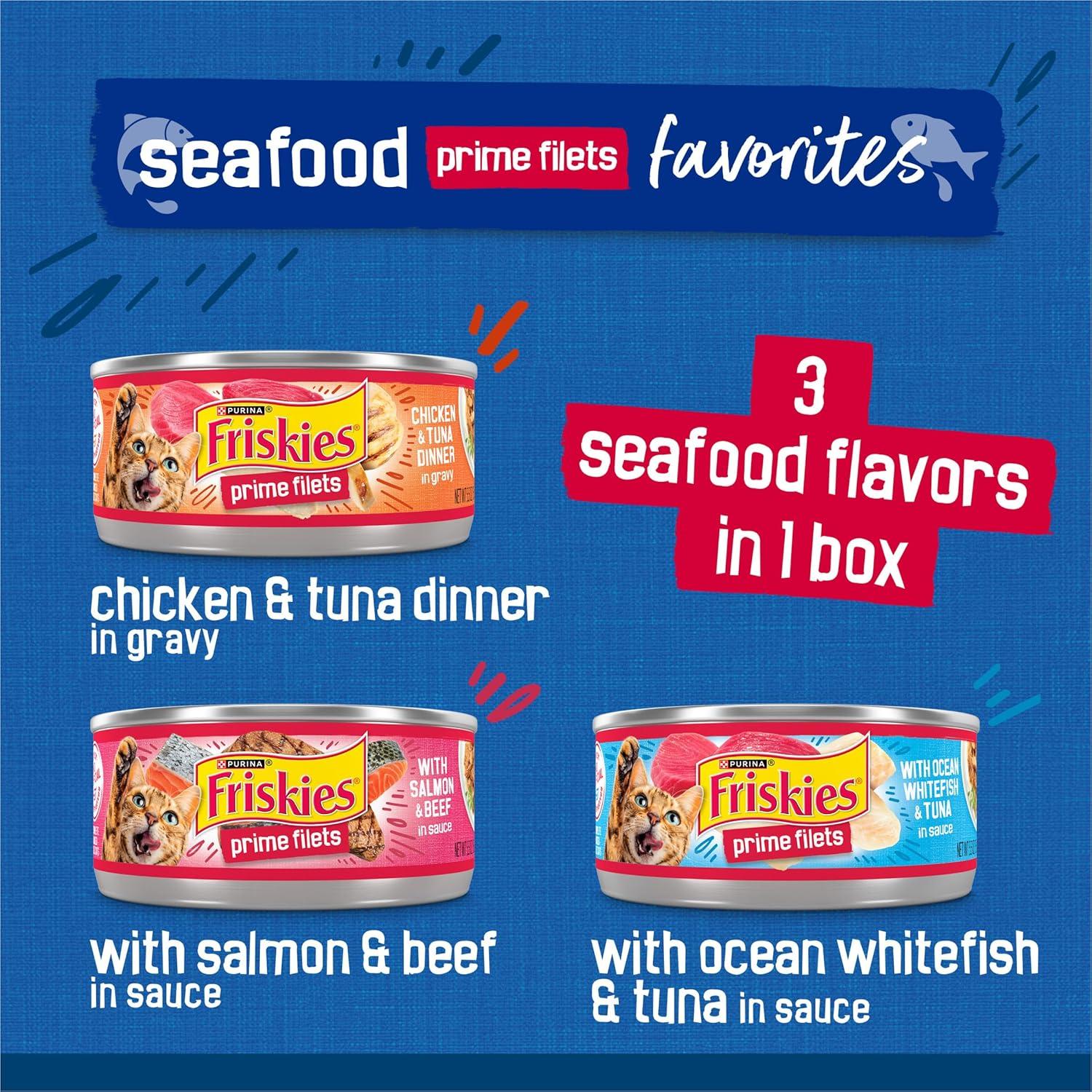 Let your cat's taste buds set sail with the flavors found in this Purina Friskies Prime Filets Seafood Favorites variety pack wet cat food. Four different recipes bring yummy fish flavors, along with the added flavors of beef or poultry, to her dish. The mouthwatering shredded chunks of protein satisfy her cat cravings, and the savory gravy or sauce found in every recipe is sure to have her licking her chops. Let the intoxicating aromas guide her to you every time you open a can, and watch as she gleefully nibbles away at the tasty goodness you place before her. With 24 cans in this variety pack, it's easy to keep your pantry filled with her favorite mealtime selections. The delishness in every serving of Purina Friskies Prime Filets Seafood Favorites canned cat food satisfies your feline's cravings, so offer her a different variety at every feeding to keep her excited about what you put in her dish, and show her just how much she is loved and appreciated with every scrumptious bite.