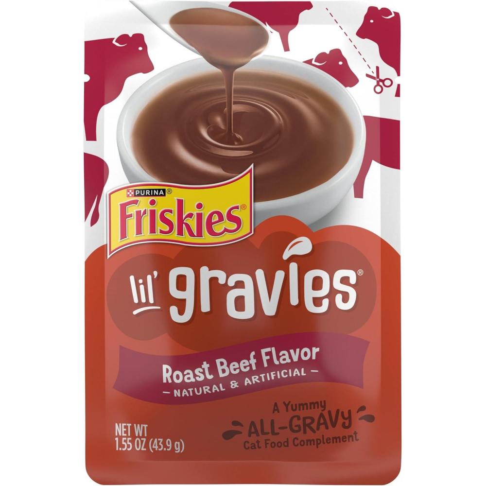 Take your kitty to a gravy purr-a-dise when you serve her Friskies Lil’ Gravies Roast Beef Flavor Cat Food Complement. Made with tasty roast beef flavor, each pouch of this gravy-licious goodness can be used as a topper for soft dry cat food or as a treat on its own. The savory recipe adds excitement and moisture that your cat craves. And when you pair it with a crunchy dry cat food, she will enjoy the variety of texture and tastes down to the last bite. Each appetizing experience is packaged in a single-serving pouch, making it easy to shake, tear and pour your way to a delicious meal for your darling cat. We bet your feline friend can never get enough gravy in her dish. So we made sure that each serving of this yummy all-gravy cat food complement offers added moisture and whisker-licking flavor. Backed by more than 90 years of Purina research and innovation, the Friskies team of experts creates recipes that every cat’s diet needs.