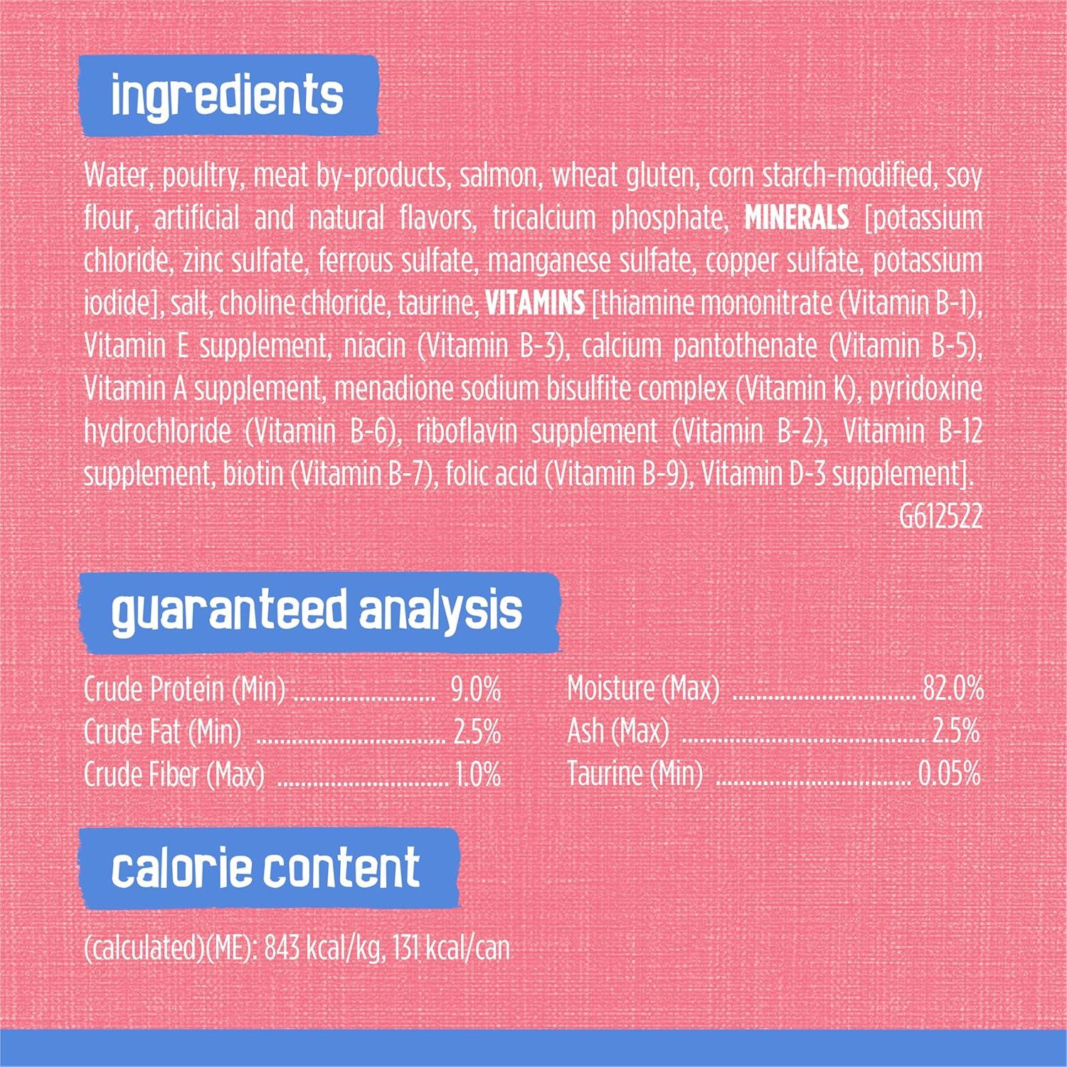 Your spoiled feline will dive in whiskers first when you fill her bowl with this Purina Friskies Shreds With Salmon in Sauce wet cat food. This yummy wet cat food puts your cat's senses into overdrive from the moment you pop the can open and the ocean-inspired salmon flavor hits the air. The thin shreds of real salmon have a pleasing texture that she can really sink her teeth into, and each bite of nourishing food is surrounded in a creamy sauce for an added bit of yumminess that will keep her enjoying each serving down to the last drop. You can feel good about giving her this salmon cat food because it's enriched with essential vitamins and minerals that she needs, providing 100 percent complete and balanced nutrition with each and every meal. Show your cat how much you care about both her wellness and her happiness by feeding her this nutritious wet cat food, suitable for both adult cats and kittens.
