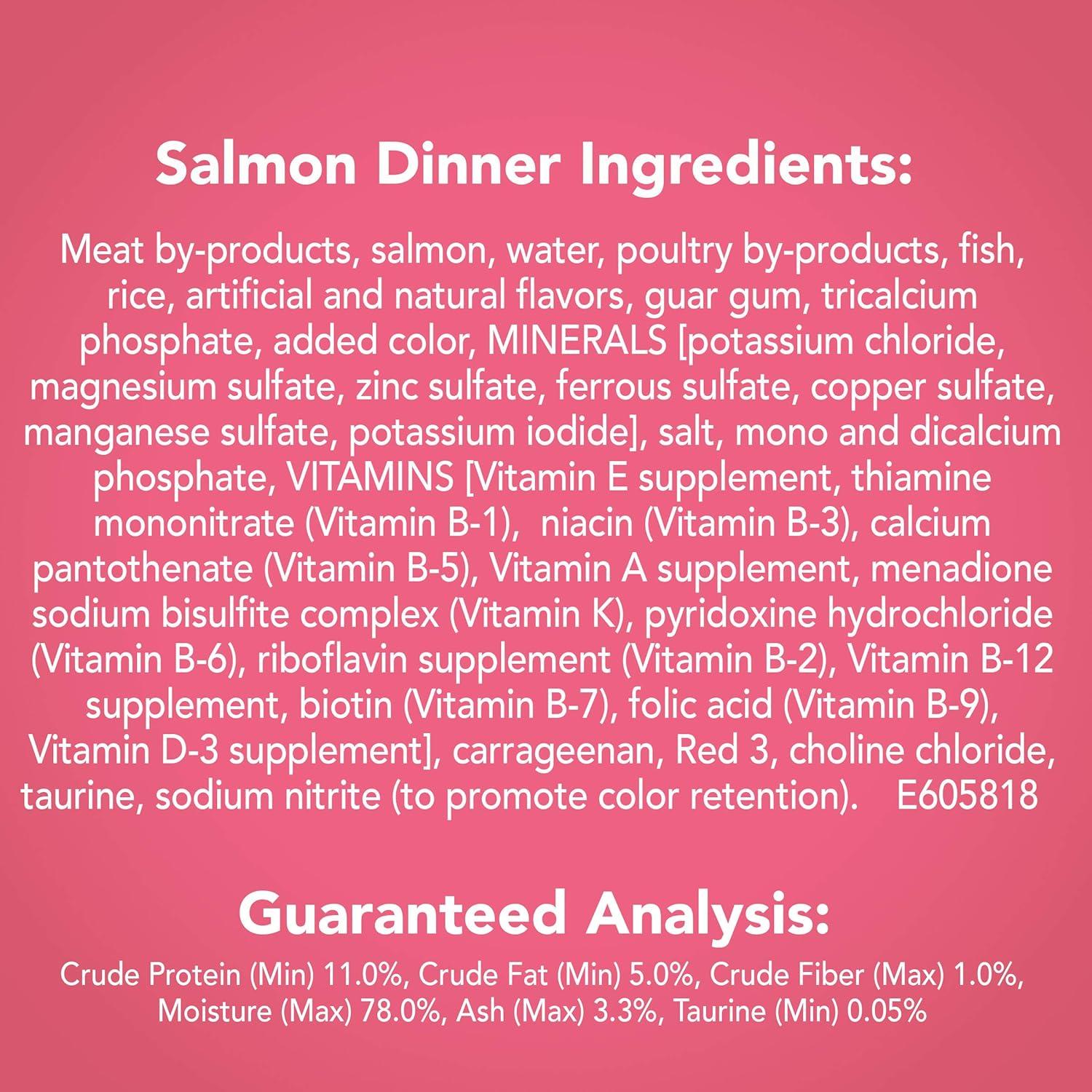 Sate your cat's desires for savory seafood with Purina Friskies Pate Salmon Dinner wet cat food. The salmon flavor delivers the taste cats love, while the smooth pate texture gives her a tender, palate-pleasing reason to savor every mouthwatering morsel in her dish. Open a pull-tab can, and let the enticing aroma of this Friskies cat food lure her to you at mealtime. Every serving of this Purina cat food offers 100 percent complete and balanced nutrition for the growth of kittens and maintenance of adult cats, so this wet cat food can follow your darling cat through every stage of her happy life with you. With so much yummy goodness packed into every bite, this Purina Friskies Pate Salmon Dinner wet cat food is sure to be a favorite in your cat's diet. Fill her dish at mealtime with this canned wet cat food every day, and show her that you pay close attention to what most excites her taste buds.