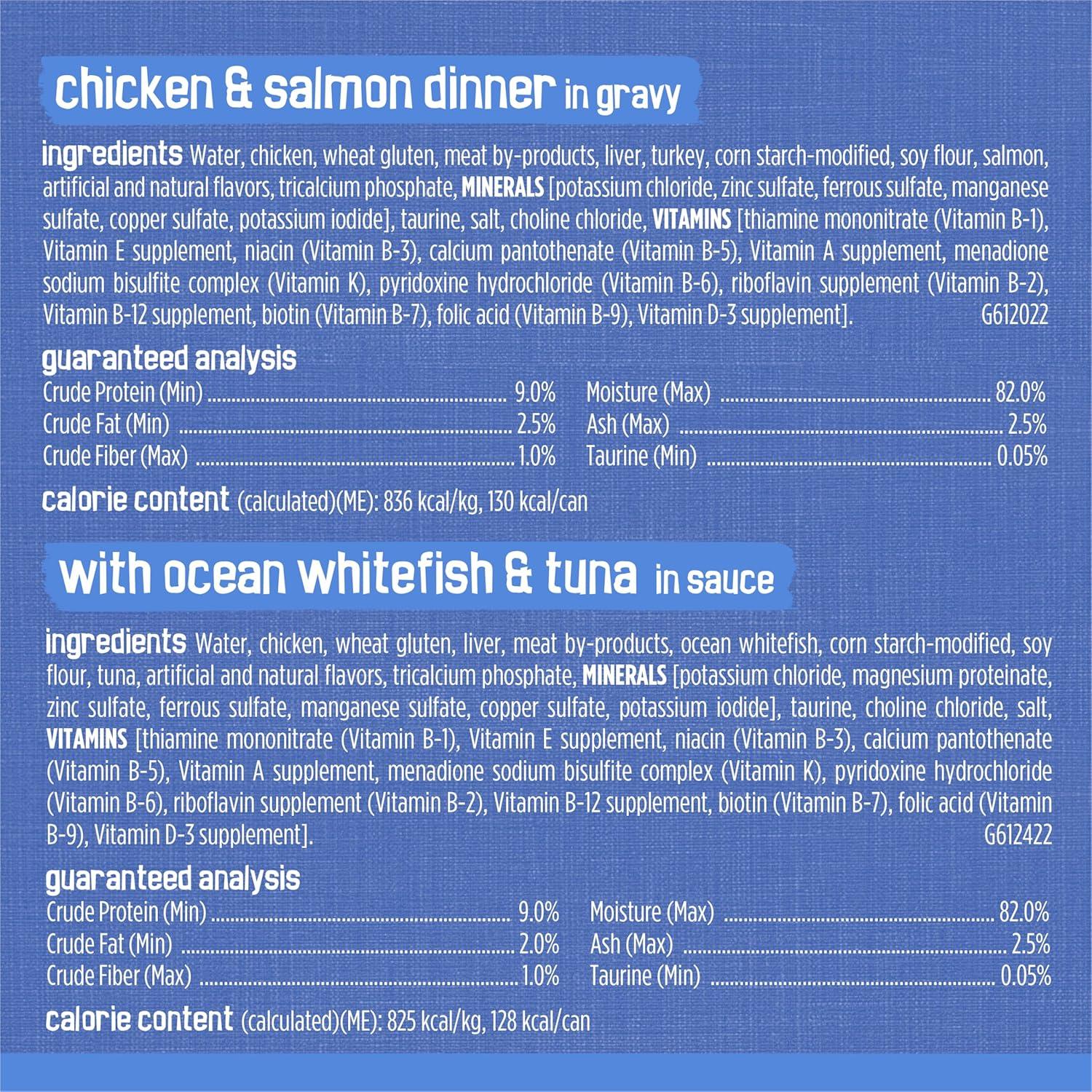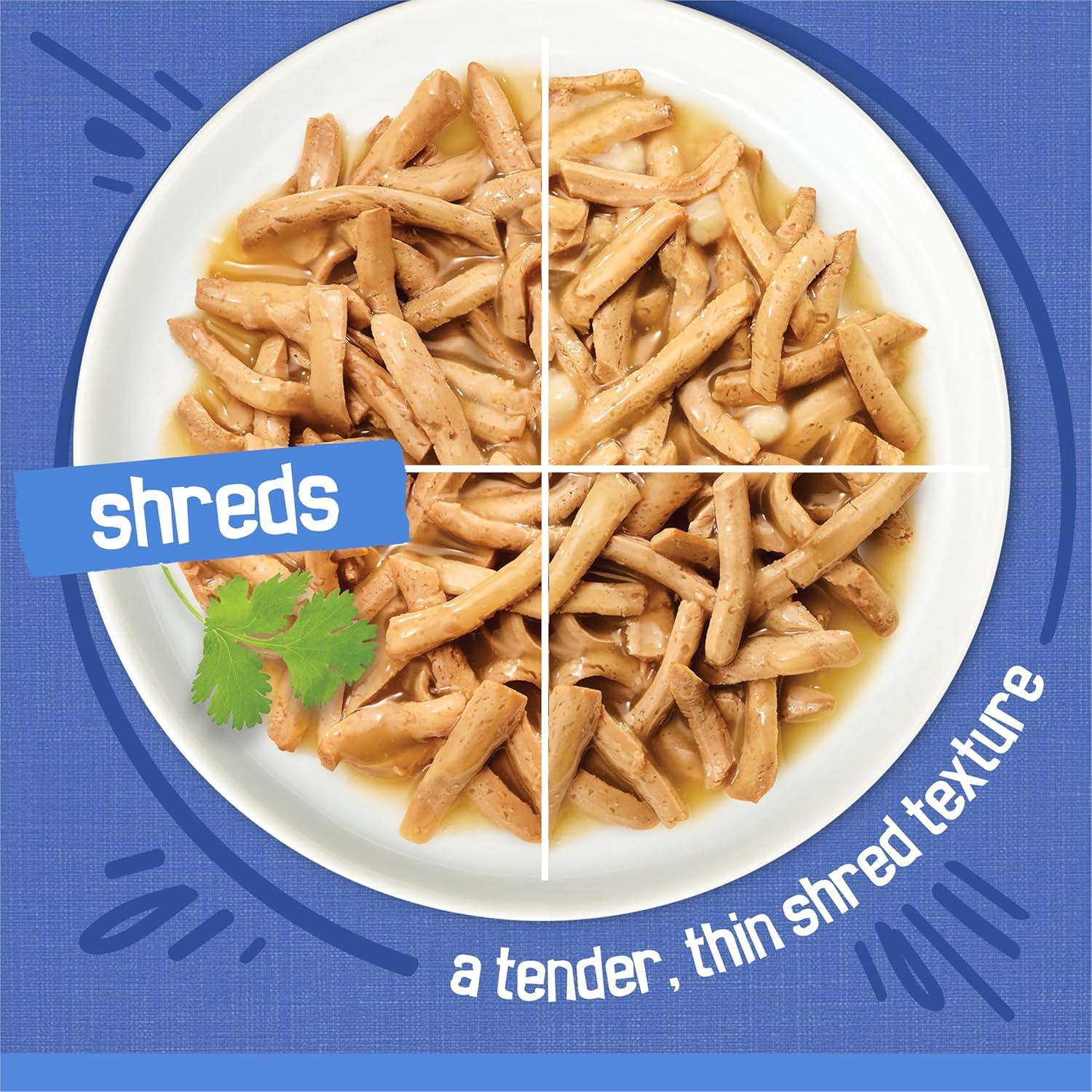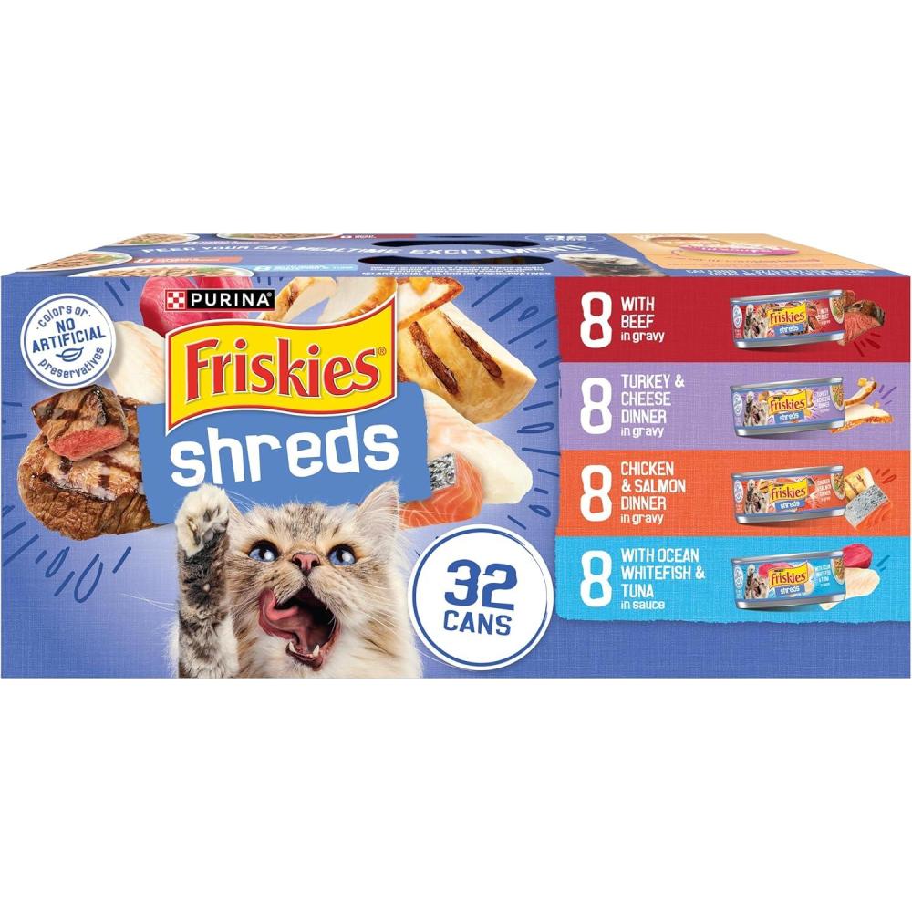 Answer your cat's flavor cravings with this Purina Friskies Savory Shreds adult wet cat food variety pack. Each pack contains four equally tempting entrees, including Purina Friskies Savory Shreds Chicken and Salmon Dinner in Gravy, Turkey and Cheese Dinner in Gravy, With Ocean Whitefish and Tuna in Sauce, and With Beef in Gravy. Every recipe features real meat, poultry or fish along with other high-quality ingredients you can both appreciate. The thin, tender shreds deliver an irresistible texture, while the savory gravy and sauce pile on the yum in every bowl. She's sure to love the delightful tastes, and you can have fun watching her enjoy licking her dish clean at every feeding. Stock up on her favorite flavor combinations, and give her meal options that are as delicious as they are nutritious with this Purina Friskies adult wet cat food variety pack. It's quick and easy to get the tasty wet cat food your pet deserves when you place an order for Purina Friskies on Amazon.com.